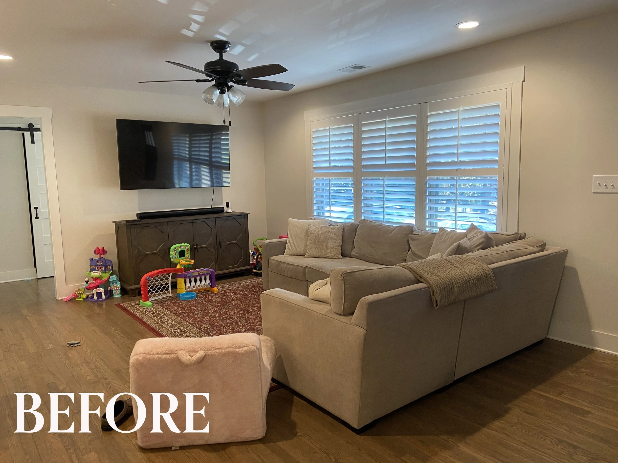 In the living room, one of the first things we addressed was scale. As you can see in the before photo, the room needed a larger rug and a more substantial media console to anchor the space. I sourced this beautiful textured white console from one of my go-to Atlanta furniture shops, and it checked every box: the right size, the right visual weight, and—bonus—it offered even more storage.