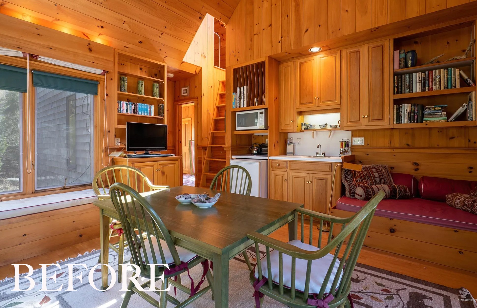This home is very unique. It’s a series of four separate buildings— the main house, the principal suite, the guest house, and another smaller guest house. Each room is wrapped in pine on the walls and the ceilings. The amount of charm pouring out from these buildings is incredible. As with many cottages in Maine, it was furnished with an assortment of smaller items, tchotchkes (see the eagle above the kitchen in the before image below below) and more traditional furniture pieces. The clients fell in love with the remote setting, the wild landscape, the ocean views, and the layout of the buildings all surrounded with wrap around porches.